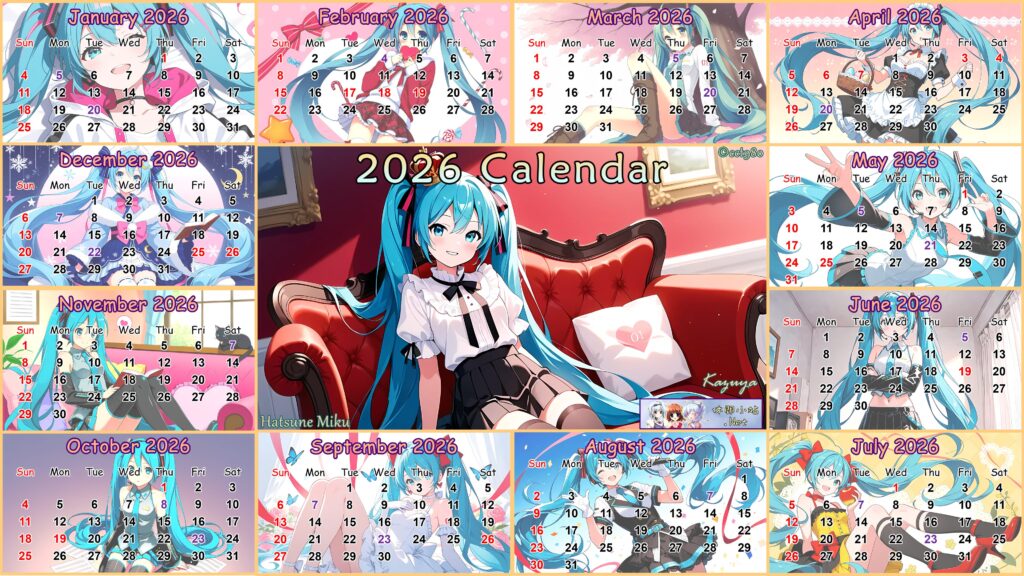 Kazuya Chan 2025 年 12 月 30 日 尚無留言 Late post, the Calendar 2026 was released, only the desktop version (16:9 ratio), I will try to create an A4 version later if I can. The calendar 2026 theme is Hatsune Miku, with all of the background pictures, with my artwork. Post Views: 34 分享此文:FacebookX請按讚:喜歡 正在載入... ← The January 2026 calendar released 發佈留言 取消回覆發佈留言必須填寫的電子郵件地址不會公開。 必填欄位標示為 *留言 * 顯示名稱 * 電子郵件地址 * 個人網站網址 在瀏覽器中儲存顯示名稱、電子郵件地址及個人網站網址,以供下次發佈留言時使用。 用電子郵件通知我後續的迴響。 新文章使用電子郵件通知我。 Δ
