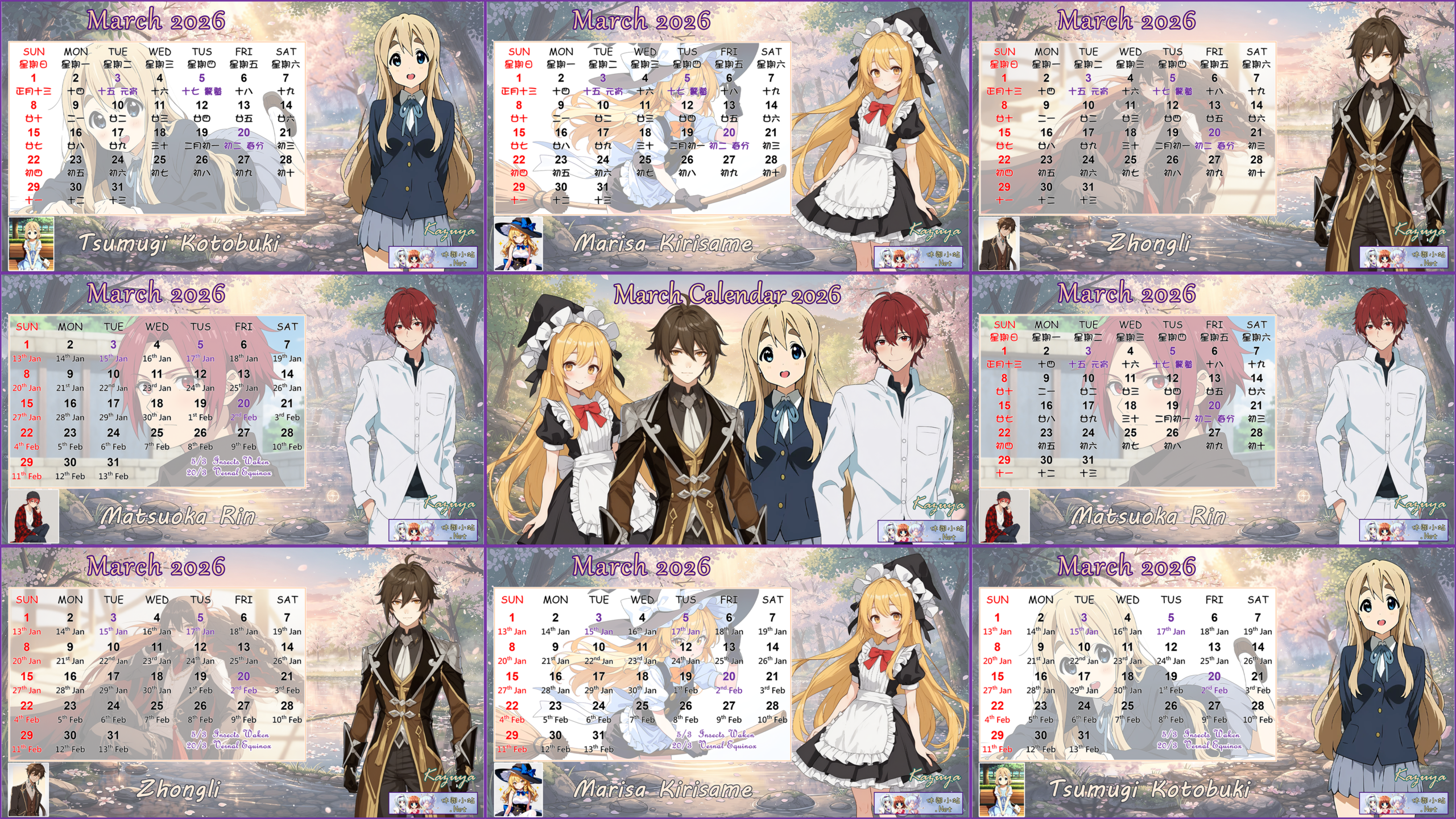 Kazuya Chan 2026 年 2 月 25 日 尚無留言 The monthly calendar for March 2026 has been completed. The combined picture will be released first, and the calendar will be released later. 2026年3月的月曆圖已完成,現先發佈組合圖片,其月曆圖會稍後發佈。 Post Views: 21 分享此文: 分享到 Facebook(在新視窗中開啟) Facebook 分享到 X(在新視窗中開啟) X 請按讚:喜歡 正在載入... ← The February 2026 calendar released The March 2026 calendar released → 發佈留言 取消回覆發佈留言必須填寫的電子郵件地址不會公開。 必填欄位標示為 *留言 * 顯示名稱 * 電子郵件地址 * 個人網站網址 在瀏覽器中儲存顯示名稱、電子郵件地址及個人網站網址,以供下次發佈留言時使用。 用電子郵件通知我後續的迴響。 新文章使用電子郵件通知我。 Δ